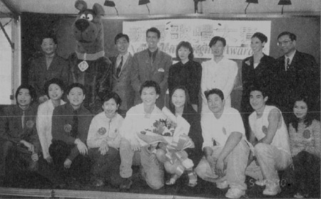 She's the one in the middle with the flowers!! This picture was taken during the Press Conference on May 18th, 2000. To the surprise to all the contestants (Left to right: Eric, Jennifer, Vincent, Lydia, Clement, Lisa, Bernie, Alvin--the duet and Wingie), they were informed the day of the conference that they would be having a friendly competition. The winner would be determined by all the reporters and sponsors present that day.......... and lo and behold, Lisa won! Even though she won the friendly competition, everyone still did very well. Kudos to all the contestants!! Full